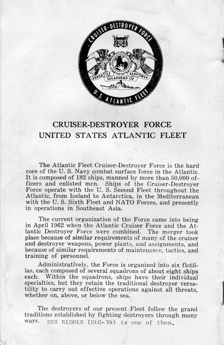 While the pamphlet’s message from the Commanding Officer is signed by CAPT Maylon Scott, first Biddle CO, the commanding officer when I reported aboard was CAPT Alfred Olsen. That Biddle‘s commanding officer was a Captain and not a Commander reflected the status of DLGs at the time.
