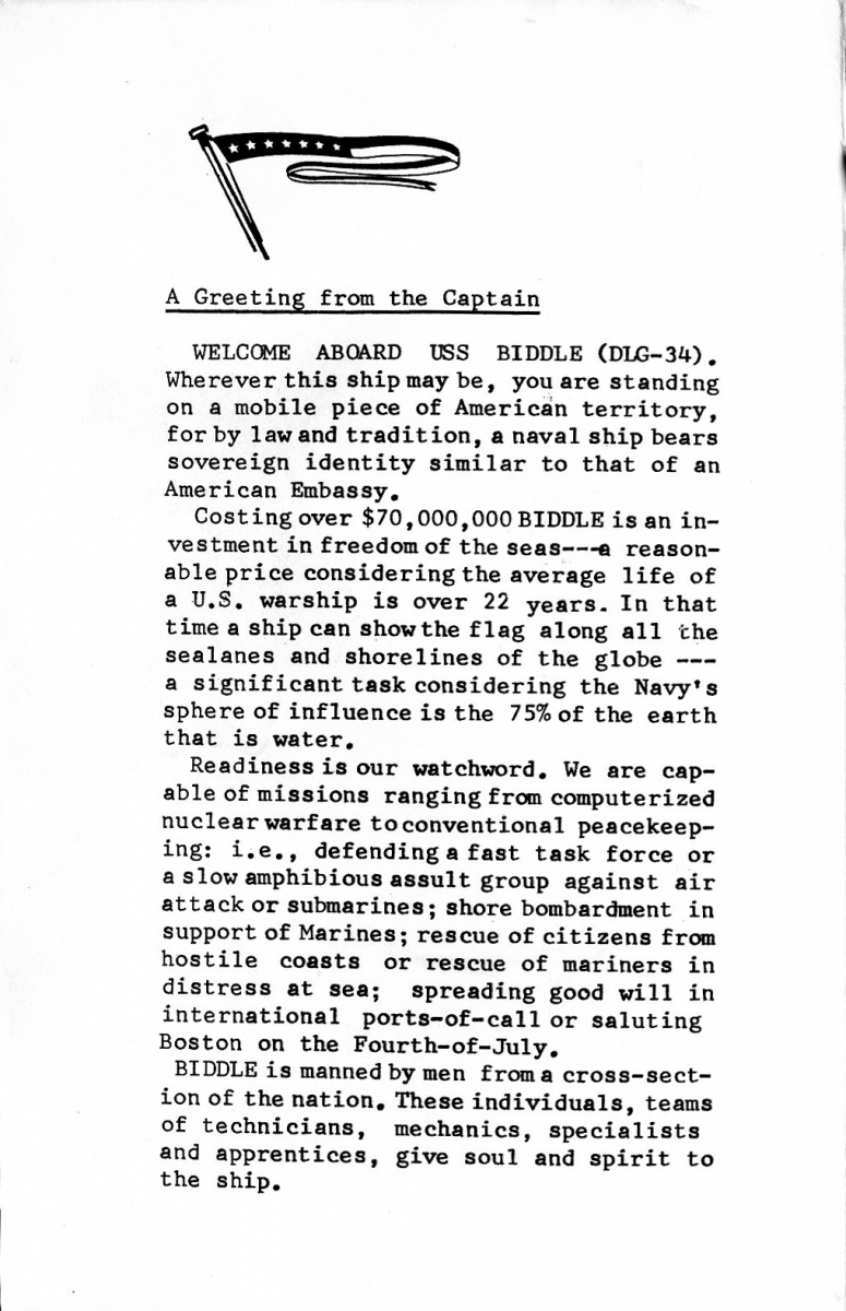 While the pamphlet’s message from the Commanding Officer is signed by CAPT Maylon Scott, first Biddle CO, the commanding officer when I reported aboard was CAPT Alfred Olsen. That Biddle‘s commanding officer was a Captain and not a Commander reflected the status of DLGs at the time.
