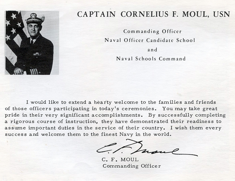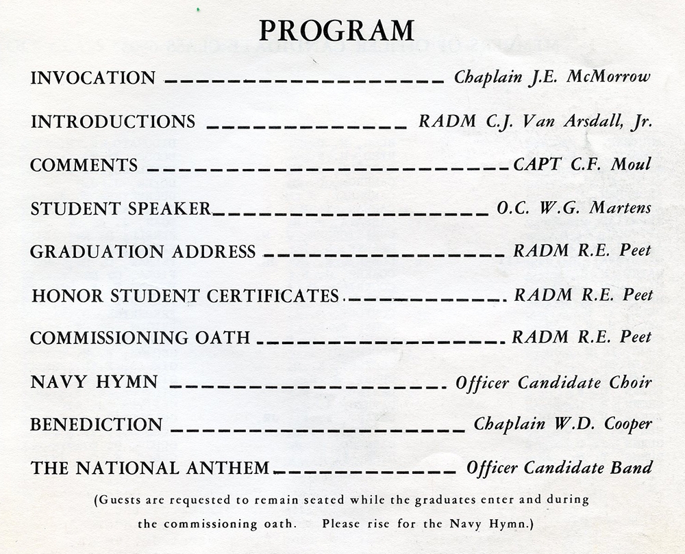 It started at 1100. We heard speeches and more speeches. Chaplain McMorrow gave the invocation and Rear Admiral Van Arsdall, commander of the Newport Naval Base, made “introductions.” Captain Moul, commanding officer of NAVOCS and the Naval Schools Command, offered “remarks.” Our student speaker was William Martens, from Oscar Company.