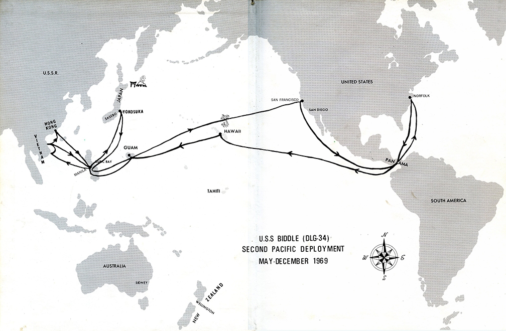 At the 2006 reunion, shipmate George Boyles provided us a CD with a video compiled from film he and fellow GMG2 Jerome Kuczmarski shot during the deployment. The video also contained still photos from the Biddle’s construction, commissioning, and decommissioning, but the film shot May-December 1969 was an especially valuable addition to the blog. Thank you, shipmates!