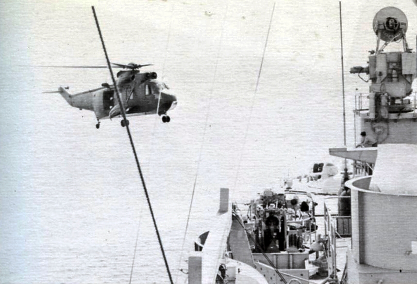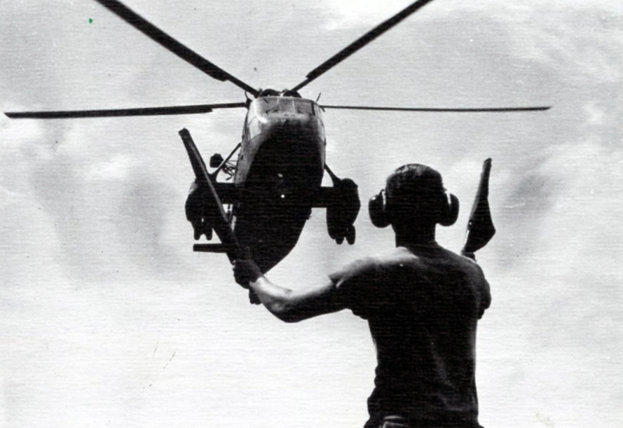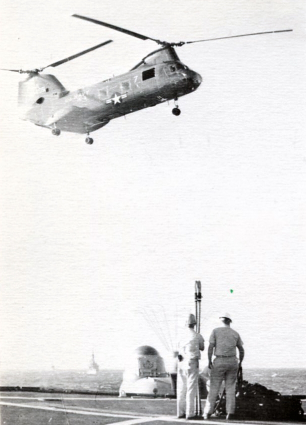 Helicopters did much more for Biddle, of course, than give the intelligence nerd rides. They brought us supplies, movies, mail. Sometimes they landed on our helo deck, sometimes they hovered and lowered materiel to the deck. Those were brief visits.