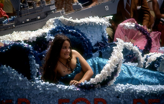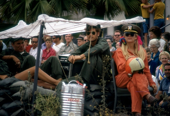 They traveled from North Island to the “Hotel Del” in a motorcade along Orange Avenue, Coronado’s main drag. A 30-minute leisurely drive with thousands lining the avenue. (I have a picture that’s closer than the one above, but Nixon’s waving arm blocked his face. Much better views in the video further down.) I assume I and others at Naval Special Warfare Group Pacific had asked permission to use our lunch hour to watch.